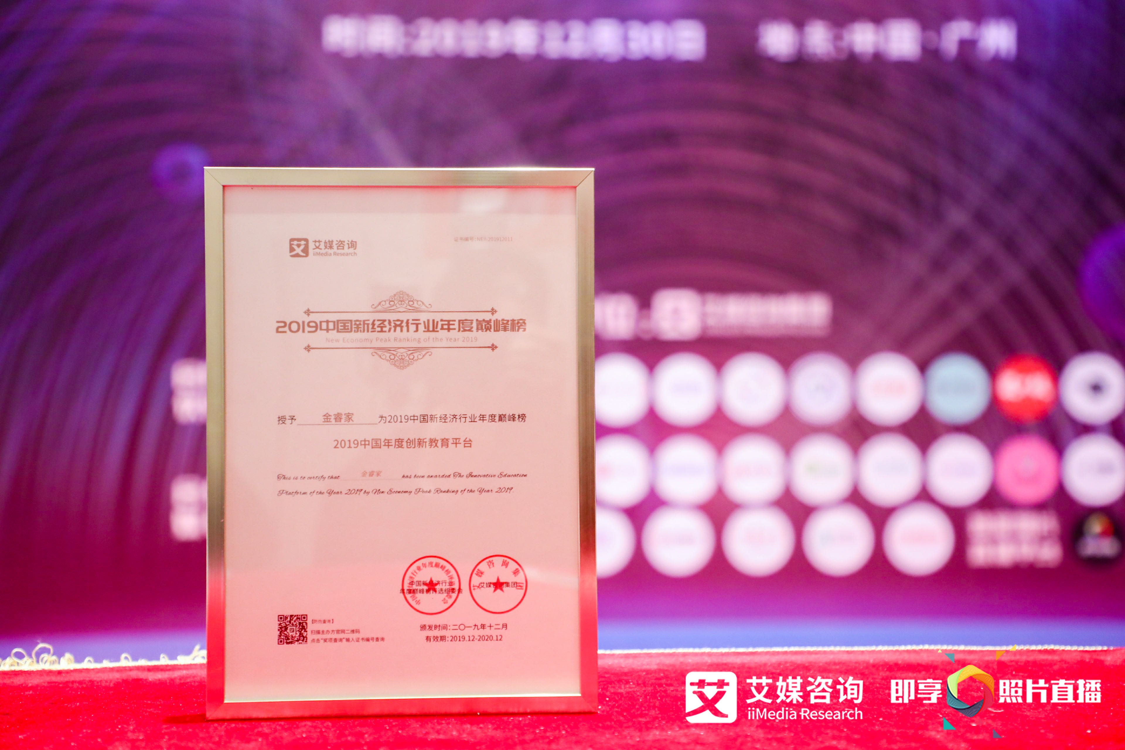 金睿家获"艾媒2019中国新经济行业年度巅峰榜"年度创新教育平台奖