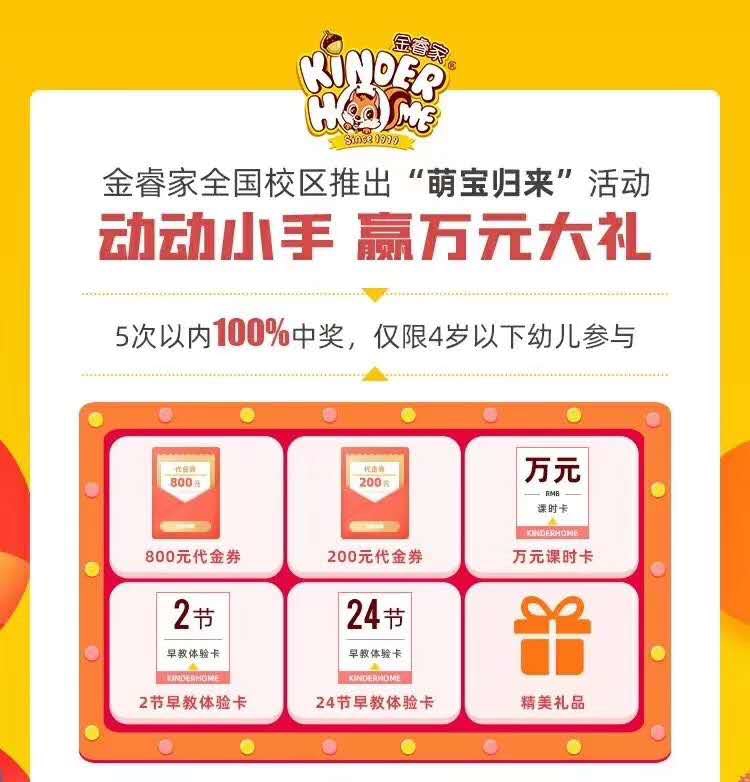 为此,金睿家特推出“抽奖送好礼”的环节,从万元课时到800元代金券, 从24节体验卡到精美礼品,10天时间已有3万家庭参与抽奖。我们知道,待到疫情结束,萌宝归来时,为孩子做一次理性投资,负责任的选择,是每个家长都希望孩子有一个更好的未来!
