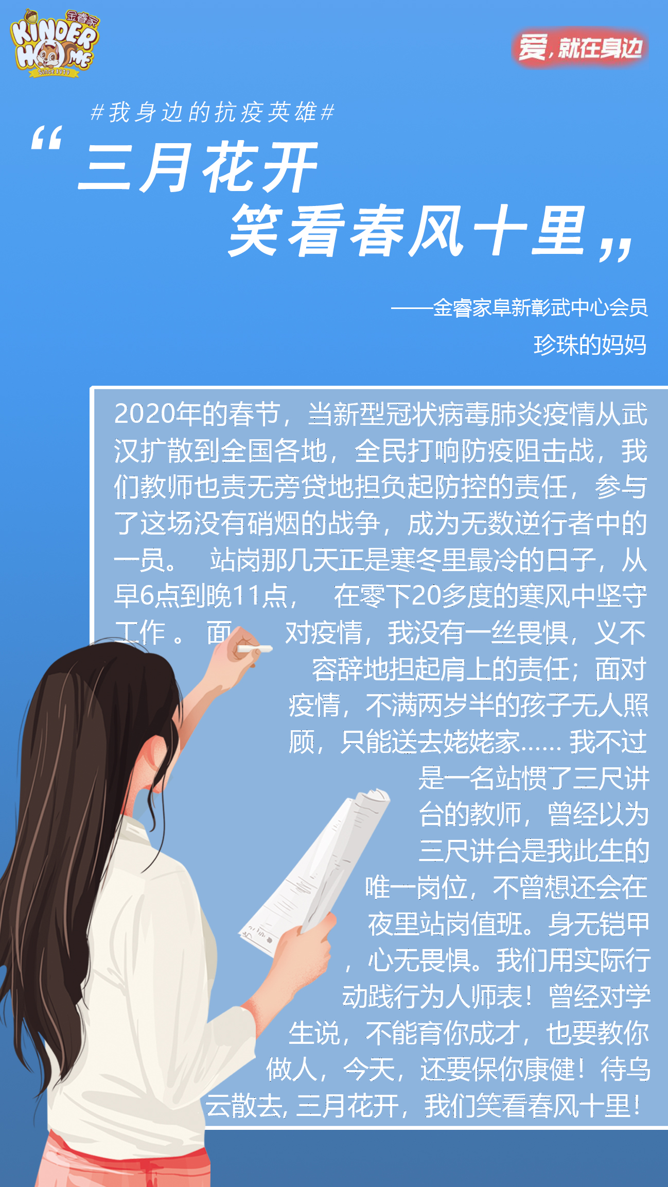 前段时间,金睿家大中华区总部联合全国100多家盟商,推出“身边的抗疫英雄”主题征文活动,希望通过此次征文,能搜集到金睿家长们感人的故事,把灾难当成教材,完成好这场生命教育、信念教育、科学教育和道德教育,为孩子们树立正确的人生观、价值观,培养孩子们奋斗精神和家国情怀。