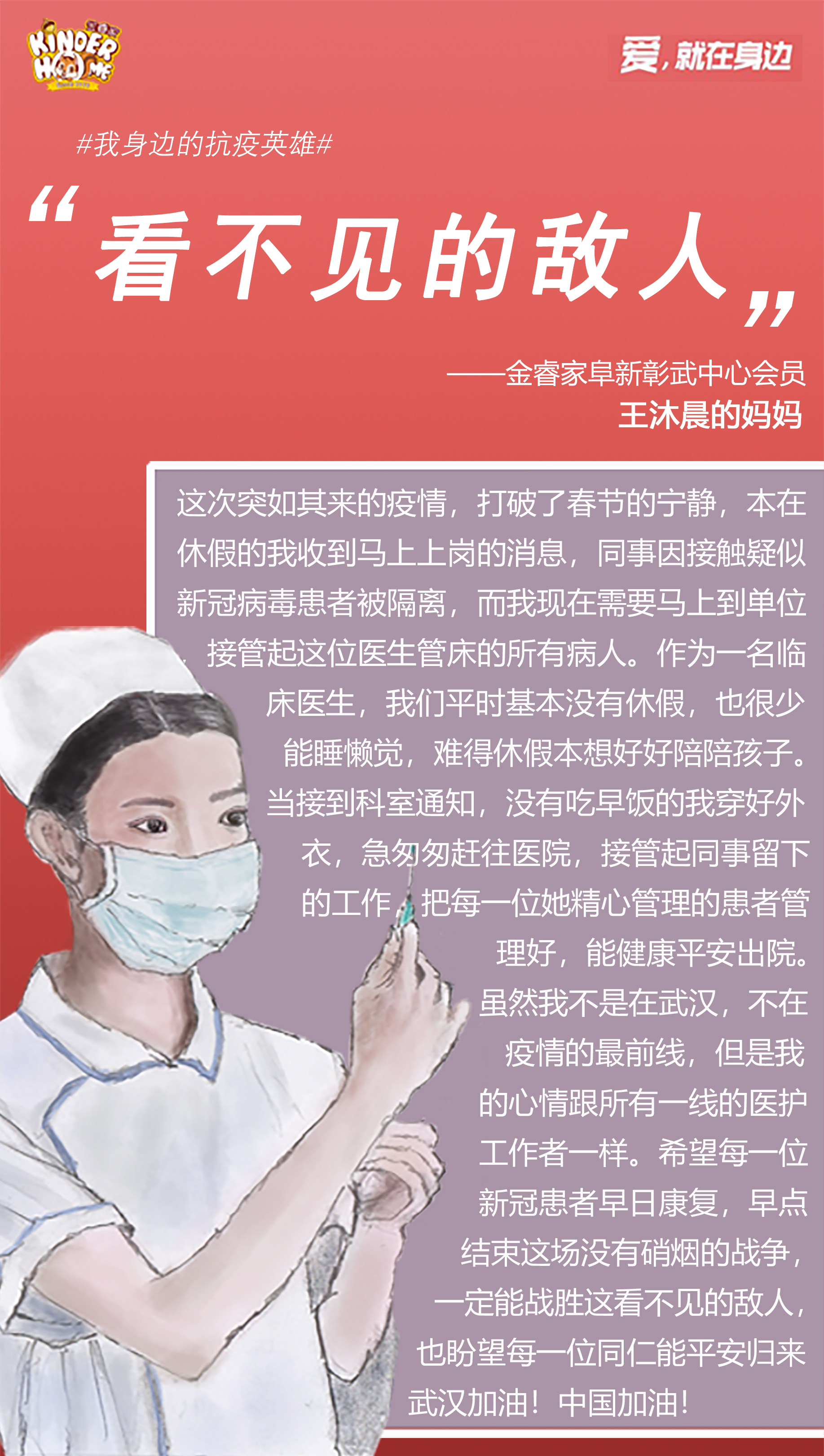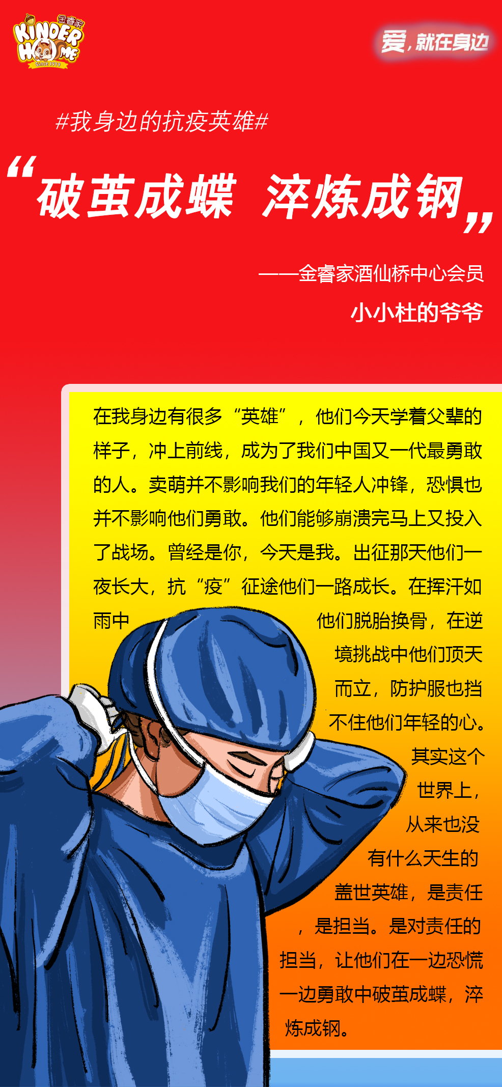 从活动开始到结束,金睿家总号后台陆续收到几十封感人信件,经评审最终甄选出5份“逆行者”的抗疫英雄故事,在此分享给大家。让我们用灾难见证成长的足迹,让不幸成为通向幸福的桥梁!