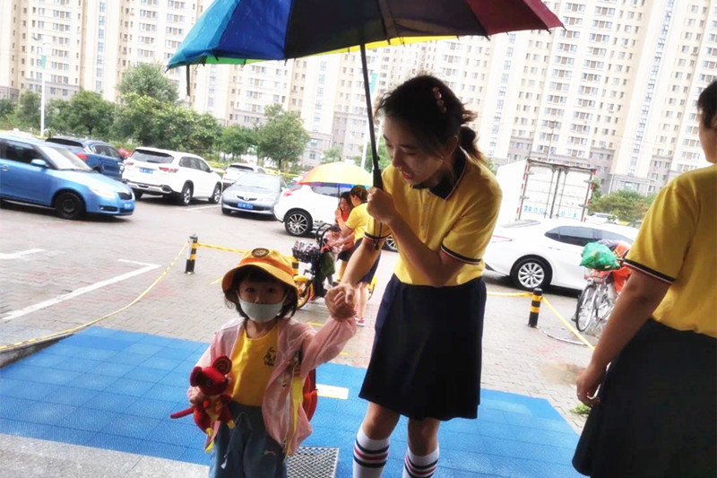 小雨里,微风中,阳光下……每一个朝气变幻的清晨,金睿家的老师都会不变地在门口迎接孩子们的到来,就像迎接回家的孩子,暖意写满双眼,快乐开启一天。