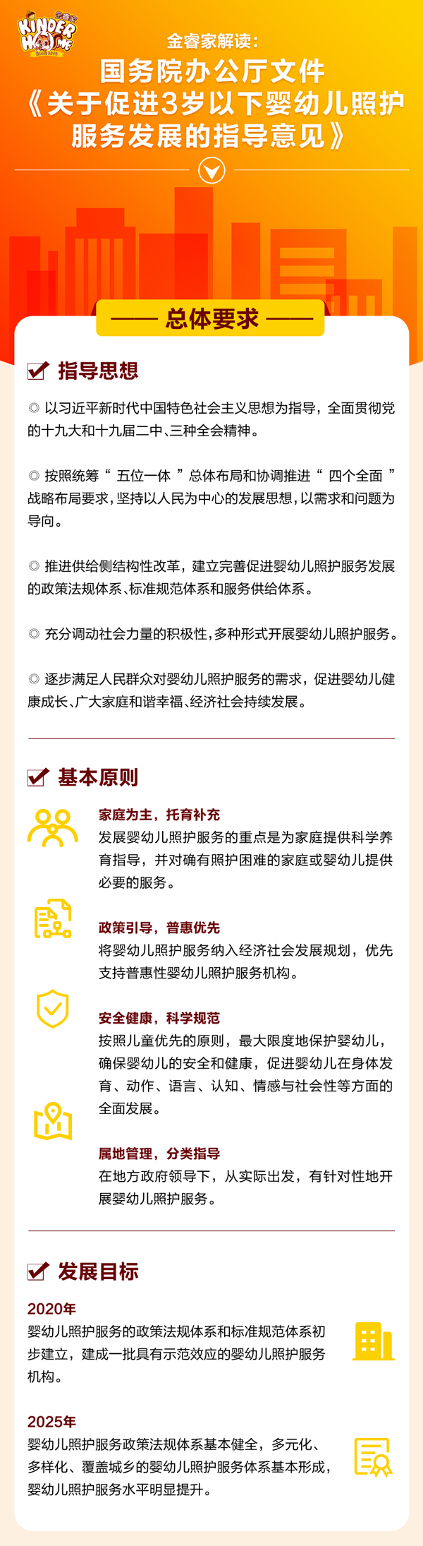金睿家作为国际知名教育品牌,拥有40年历史背景,在全球13个国家有超150家中心,我们先进的国际化教育理念、管理经验、非竞技性教育原则、多维全面的课程体系,势必会在大势所趋的时代洪流中,引领早教、托育市场的行业规范,培养更多国际化视野的人才!接下来,金睿家将针对《关于促进3岁以下婴幼儿照护服务发展的指导意见》,为大家做详细的政策解读。